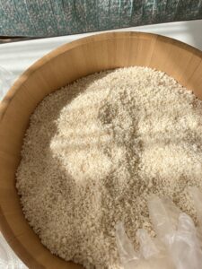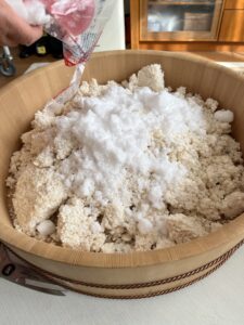 まず、桶に麹と塩を入れて混ぜ混ぜ。