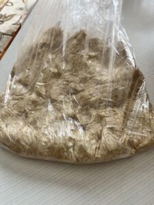 大豆をビニール袋に入れて、ビールの瓶でガンガンつぶしていきます。潰した大豆を桶に入れます。これを何度も繰り返します。