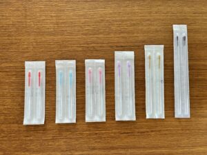 (写真左から 1番鍼、3番鍼、4番鍼、5番鍼、8番鍼、中国鍼)